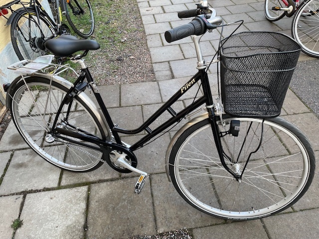 Elegant och bekväm damcykel,      3 växlad med fotbroms,belysning, korg och plugin lås. Svart